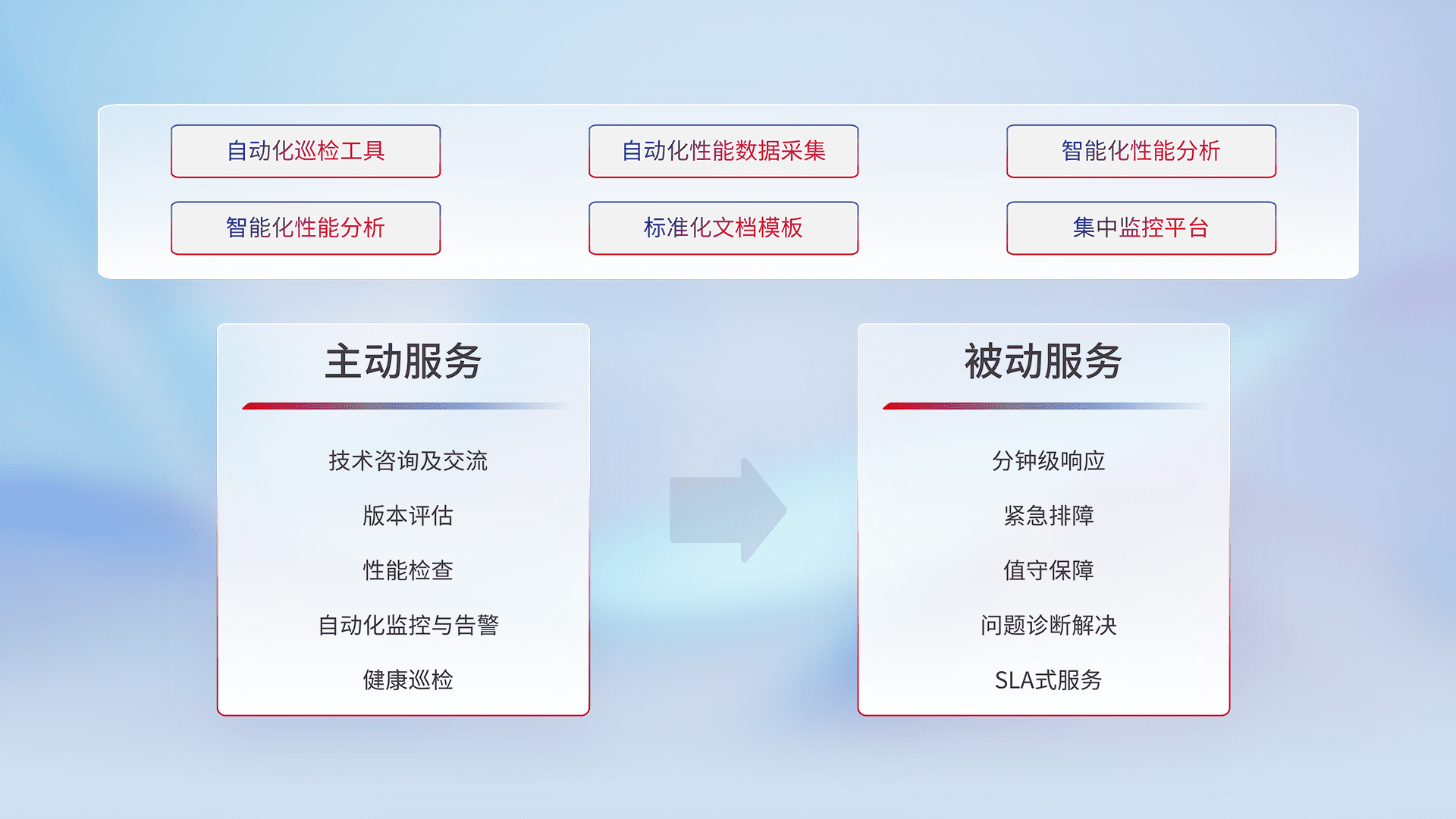 智能化工具和标准化文档,,,保障服务质量,,,提供主动服务(包含技术咨询、、版本评估、、性能检查、、、、自动化监控与告警、、、、健康巡检)和被动服务包含(分钟级响应、、紧急排障、、值守保障、、问题诊断解决、、、SLA服务)。。