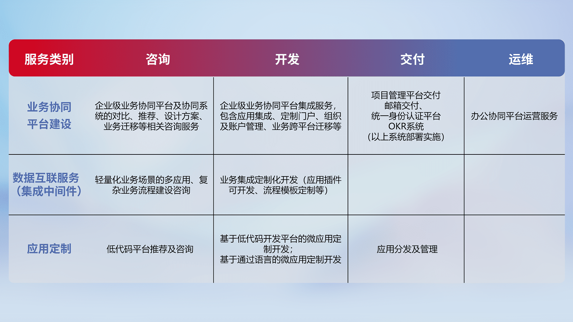 针对钉钉、、企微、、、IDaas等平台级产品提供产品的规划、、、、方案、、、、交付、、、定制化开发等服务,,,实现如统一协同办公、、、、智能客户服务、、混合会议管理、、智能数据查询、、等业务场景,,,,实现数字化转型。。